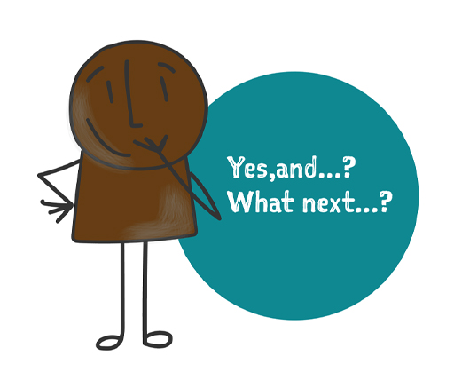 ‘Yes, and …’ is a common feature of improvisation in the theatre. Performers use it to make sure the scene keeps moving forward. By saying ‘yes’ you are acknowledging what the other person has said and the ‘and’ moves it forward. This means that the possibilities of the conversation are kept open to be played with and built on.
