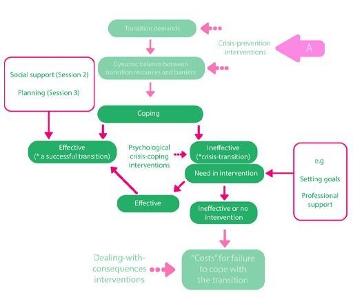 If you think back to the athletic career transition model (Alfermann and Stambulova, 2007) that you were introduced to in Session 1, you may remember that having the right coping strategies in place can determine whether transitions are effective or ineffective. Below is an adapted version of this model which has had some additions to illustrate the different coping strategies and interventions that can be implemented to assist a successful transition.