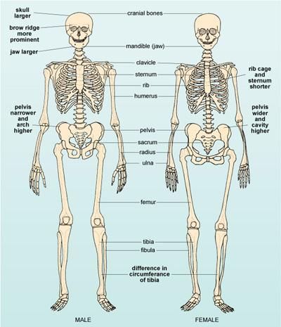 Figure 6 Comparison of male and female skeletons, showing the key differences and the main bones used in analysis.