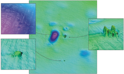 Figure 2 Sonar image of the Mary Rose wreck site after the ship was raised from the seabed (central image). The image top left (purple) shows a close-up of the deep hole where the ship had lain before she was raised from the seabed. The image bottom left shows a close-up of a nearby seabed feature. The top right shows a close-up of the dive frame that was used during the excavation which was left on the seabed.