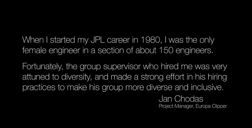 [TEXT ON SCREEN]: When I started my JPL career in 1980, I was the only female engineer in a section of about 150 engineers. Fortunately, the group supervisor who hired me was very attuned to diversity, and made a strong effort in his hiring practices to make his group more diverse and inclusive.