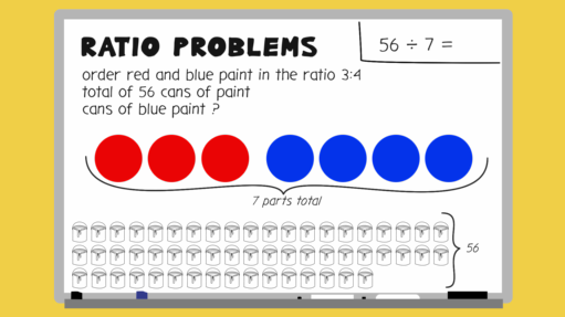 The first step to finding out, is to work out the total number of parts by adding together the parts of the ratio. If there are three parts red and four parts blue, that makes a total of seven parts altogether. Next, you need to work out what one part is worth. To do this, divide the total number of paint cans ordered, by the total number of parts. 56 divided by 7 equals 8. One part is worth eight cans.