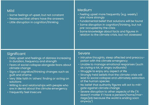 Based on her clinical practice, psychotherapist Caroline Hickman has tried to categorise eco-anxiety by developing a simple scale (Hickman, 2020). However, she cautions about using it too rigidly or in an overly clinical medicalised way. This is a shortened version of her scale.