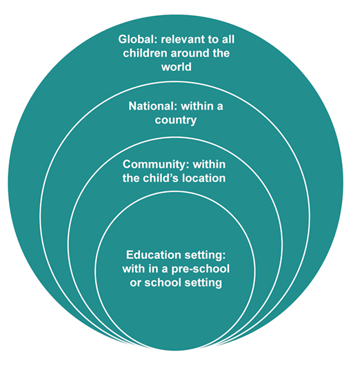 As already stated, we all need to take responsibility for supporting, promoting and ultimately, playing our part in improving children’s health. This responsibility needs to be a global endeavour, because improving the health of babies and children requires the support of adults in every community in countries around the world. To help individuals to achieve this goal, babies and children’s health is addressed in legislation and policy. Legislation relates to the creation of laws that are made at national or global level. Policy can be described as a course of action that implements legislation. Figure 1 illustrates where legislation and policy exist, which can be described as global, national, within a community and within education settings.