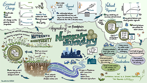 The Floodplain Meadows Partnership has compiled a database of phosphorus budgets over the past 20 years. They suggest meadows are net exporters of phosphorus from river systems. The mean export of phosphorus is 7.9 kg ha-1 yr-1 to the wider environment (assuming a single hay crop and three floods per year.).