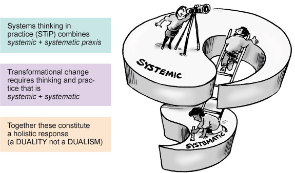 Western intellectual traditions have laid greater emphasis on systematic thinking and action than on systemic thinking and action. If you are educated in the western tradition, it is often hard to escape the trap of thinking that can be described as mechanistic, linear, reductionist and systematic, with all those attributes in service of certainty and control. It is necessary to practice so as to break out of this trap, but ain doing so we must be wary not to steer away from one pitfall just to walk into another. The perspective of this course is that one can also fall into a trap by considering systemic and systematic as an either/or choice. Instead, understanding systemic and systematic thinking as a duality, two mutually supportive concepts that make up a conceptual whole that when understood can be used to increase the practical repertoire available through STiP.