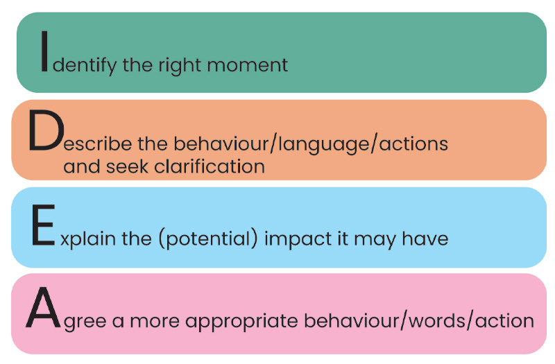 It can be uncomfortable to challenge someone’s practice or behaviour – and it is important to carefully consider how best to approach a conversation with a colleague to discuss their practice. The ‘IDEA’ method outlined below can be a good way to approach a discussion to ensure it is well received and not considered hostile criticism or over-accusatory.
