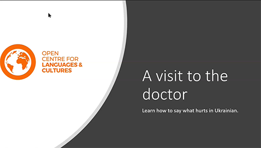 Shcho u vas bolyt? Ruka, U mene bolyt ruka; palets, U mene bolyt palets; holova, U mene bolyt holova; hrudy, noha, U mene bolyt, noha; zhyvit, U mene bolyt zhyvit; oblychchia; Shcho u vas bolyt? Horlo (throat), U mene bolyt horlo; vukho, U mene bolyt vukho; zub, U mene bolyt zub; nis, U mene bolyt nis; oko, U mene bolyt oko; Shcho u vas bolyt? Sertse, U mene bolyt sertse; shlunok, U mene bolyt shlunok; likar, liky, likarka, likarnia, medbrat, medsestra.