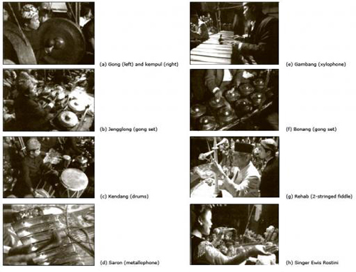 Figure 9: Instruments of the Sundanese gamelan salendro. In addition to the instruments illustrated here, the Sundanese gamelan salendro also uses: peking and panerus, identical to the saran hut tuned an octave higher and an octave lower respectively; rincik, identical to the bonang hut tuned an octave higher, and often a male singer.