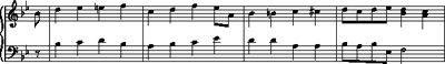 The next extract is from the last movement of an earlier sonata, K281, in the same key, B flat major. The theme is very different in rhythm and contour from that in K333, but a look at the voice leading reveals similarities.