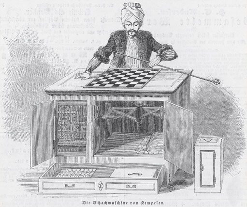 Game-playing automata. Another favourite of the 18th and 19th century public were the machines apparently capable of playing board games, usually chess, against human opponents. The most famous of these, The Chess Automaton, better known as The Turk (Figure 3), was built by Baron Wolfgang Von Kempelen and toured Europe in the 1770s. The Turk was a wheeled wooden cabinet, with a chessboard and a life-sized wooden figure dressed in Turkish style mounted on its top. This machine offered to play chess against all comers, generally defeating them (its victims included Napoleon Bonaparte and Benjamin Franklin). As The Turk appeared to ponder, and then make, its move there would be an impressive mechanical clanking and a display of moving cogs. These, needless to say, had nothing to do with the machine's play: the cabinet concealed a human chess master. Such men had to be of small stature. Working by candlelight in conditions of appalling heat and cramp, playing the game and operating the mechanics of the robot arm, while covering up coughs and sneezes, not surprisingly many of them died early deaths from alcoholism or other illnesses. The chess genius and US Chess Champion, Harry Nelson Pillsbury, worked inside a later automaton, Ajeeb, for nearly ten years. He succumbed to syphilis in 1906 at the age of 34. Both The Turk and Ajeeb were eventually destroyed by fire.