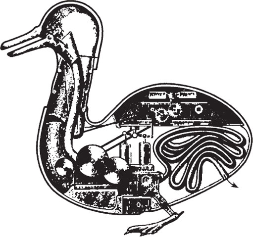 The chess-playing automata were simple frauds – as their makers well knew. The idea was to mimic intelligent life, though the audience may have been willing to believe they were in the presence of a machine that was genuinely reasoning. On the other hand, mythical creations such as the Golem were imagined as being indisputably living things, capable of independent action and of real personality. Between these two extremes there is much less certainty. Clearly, Vaucanson's Duck was only an imitation of a real duck; but with its intricate internal mechanisms, did it in some way approach reality? Would ever more complex mechanisms at some point result in a creature very like a real duck? Vaucanson himself believed he was imitating life. Descartes (of whom more later) believed that animal behaviour could be explained in purely mechanical terms. Could building a truly living creature some day be a possibility?