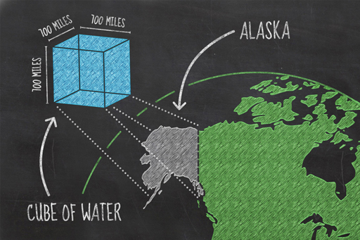 It turns out that a cube with dimensions of 1135 km × 1135 km × 1135 km comes pretty close to this volume, which brings us back to Alaska, and in truth this only covers the mainland of Alaska, which includes several of the Aleutian Isles and a long thin stretch of coastline on the western margin of Canada. Like all analogies it only goes so far, but you get the idea.