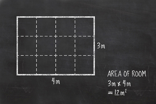 The areas of shapes like rectangles (and squares, which are a special type of rectangle) can be worked out by simply multiplying the two side lengths together. A rectangular room that is 3 metres long by 4 metres wide has an area of 3 multiplied by 4. The units for area are simply metres multiplied by metres, or as it is normally written, m2 (pronounced ‘metres squared’). So the area of the room is 12 m2, or twelve square metres.