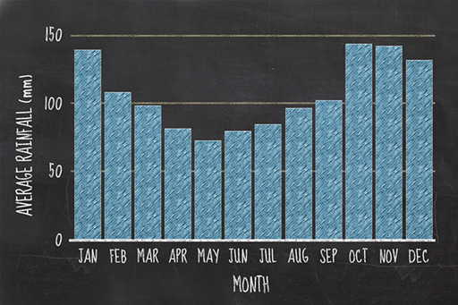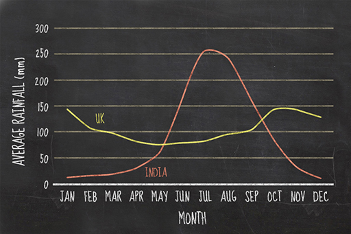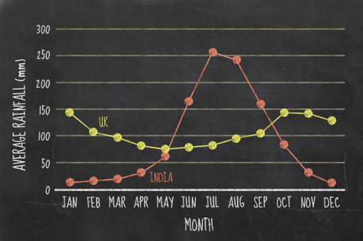 On this graph, the yellow line represents the average rainfall in the UK, while the red line represents the average rainfall in India. Between October and April in India, rainfall is on average lower than in the UK, but the summer months in India coincide with the Indian monsoon season, so these months are considerably wetter. Perhaps a graph like this might help you decide when and where to go on your next holiday!