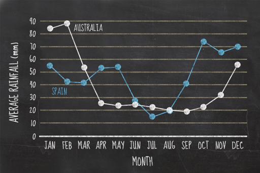 We plotted the rainfall in Spain and Australia, because both are relatively dry but in opposite hemispheres of the world, so would they have similar or different patterns?