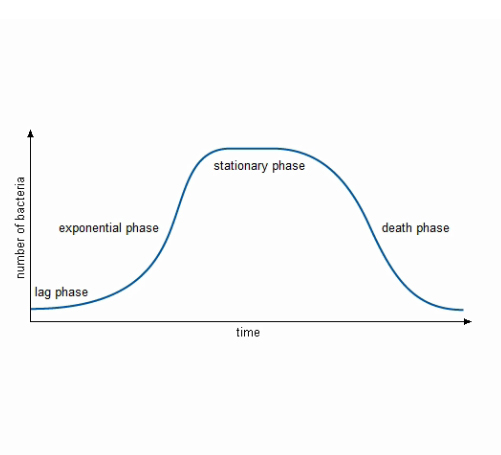 You might recall from Week 1 the typical growth pattern of a bacterial population (Figure 8 below). The death phase does not occur in the gut. This is because of the steady flow of material from mouth to anus, so that new food is always added and waste products are always removed. In the gut, the only time a population will decline like this is if something – for example, an antibiotic taken by mouth – kills it.