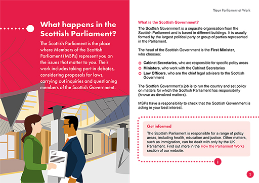 The Scotland Act 1998 gave the Scottish Parliament power to make laws (both primary and secondary legislation) in a number of areas. The Scotland Act 1998 also established a Scottish Government (at that time referred to as Executive). This consists of the First Minister and a number of ministers appointed by the First Minister. Members include the Lord Advocate and the Solicitor General for Scotland. The monarch appoints the First Minister. They are usually the leader of the party with the most seats in the Scottish Parliament. The roles of the Scottish Parliament and Scottish Government differ. In this course you consider the Scottish Parliament; if you wish to learn more about the role of the Scottish Government you can explore their website.