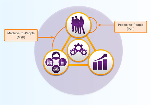 Processes are facilitating interactions between people, things, and data. Today, the IoE brings them all together by combining machine-to-machine (M2M), machine-to-people (M2P), and people-to-people (P2P) connections, as shown in Figure 18.