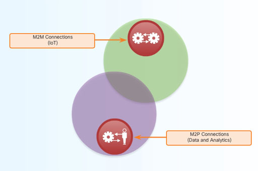 Machine-to-people (M2P) connections occur when information is transferred between a machine (such as a computer, mobile device, or digital sign) and a person, as shown in Figure 20. Whether a person gets information from a database, or conducts a complex analysis, this is an M2P connection. These M2P connections facilitate the movement, manipulation, and reporting of data from machines to help people make informed judgments. The actions that people take based on their informed judgments complete an IoE feedback loop.