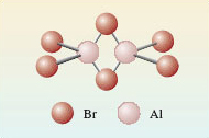 Actually this is an unfair question, because if you examine the crystal structure of solid aluminium bromide you’ll find it is actually made up of Al2Br6 molecules (Figure 3). The two aluminium atoms, and four of the bromine atoms at the ends of the molecule, lie in the same plane (at right-angles to the plane of the paper). The two bromines that bridge the aluminium’s lie above and below this plane.