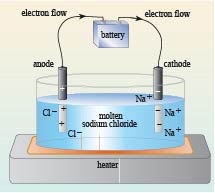 Figure 2 shows a simple experimental set-up to show molten sodium chloride (or indeed a solution of sodium chloride in water) conducts electricity. A battery is connected to two metal rods. The electrode attached to the negative terminal of the power source is called the cathode, and the anode is the electrode connected to the positive terminal.