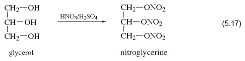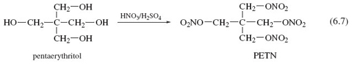 The products of Reactions 5.17, 5.18 and Figure 3 are called nitroglycerine, pentaerythritol tetranitrate (PETN) and nitrocellulose (also known as guncotton), respectively. They are three important explosives, and the synthesis of each serves to illustrate the reactivity of functional groups relative to the rest of the reactant molecule.