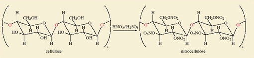 Figure 3 shows that despite this polymeric situation, all of the —OH groups can still be replaced by —O—NO2 groups through a reaction with mixed nitric and sulfuric acids.