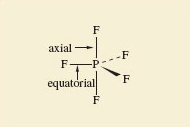 In the octahedral molecule SF6, all the fluorine atoms are equivalent. From each of the fluorine atoms, the “view of the rest of the molecule” looks the same. But in PF5 and IF7, this is not so. There are two kinds of fluorine position: equatorial positions in the horizontal plane, and axial positions at right-angles to it. In Figure 8, these two kinds of position are labelled for the trigonal-bipyramidal arrangement in PF5.