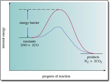 Between the reactants and products, the internal energy does not decrease gradually as the reaction progresses; instead, it rises initially, reaches a maximum, and then declines. The upper curve shows the situation in the absence of a catalyst. The internal energy of the reacting molecules must first increase by an amount marked 'energy barrier' in Figure 2.