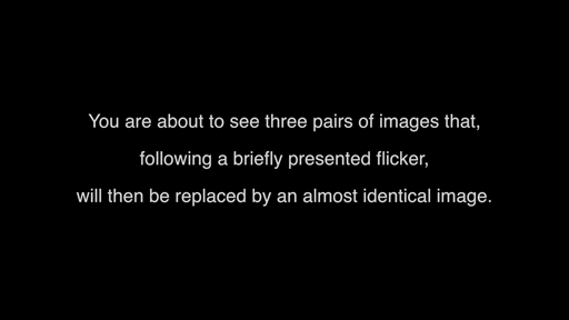 Changing the identity of a researcher or actor is a fairly obvious change, but change blindness can also occur with smaller details. The ‘Flicker paradigm’ video contains pairs of images, shown one after the other, that differ by several details. Can you spot the differences? Make a note of how many differences you can spot.