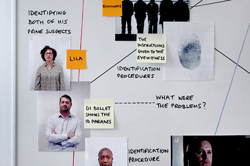 To avoid cross-contamination of their evidence, DI Bullet shows the ID parades separately to Lila and Seth. He begins with Lila, placing the nine photos in The Sergeant’s identification parade in front of her and says: