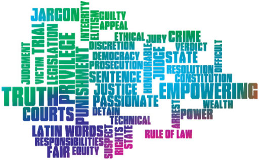 The word cloud in Figure 5 contains words that a number of our colleagues identified when we asked them to think of words they associated with law. It is not intended to be an exhaustive list but rather an illustration of the range of words and responses that can be given to the question ‘write down any words you associate with ‘law’.