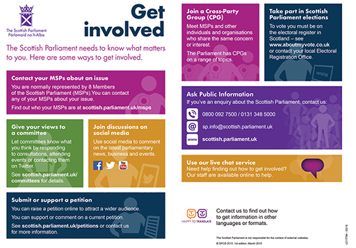 Explore the getting involved section of the Scottish Parliament website. http://www.parliament.scot/ getting-involved.aspx and in particular look to see: