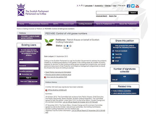 An example of a petition is provided in Figure 5. This petition was made on behalf of the Scottish Crofting Federation in response to increasing numbers of geese in the Western Isles and others (from approximately 150 breeding pairs to over 10,000 over a period of 18 years) and the impact on agriculture and threat to the continuation of island crofting. A number of goose-management schemes had been in place since 2000. These are managed by Scottish Heritage but more funding and support was being called for.