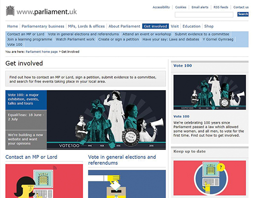 As with the Scottish Parliament website, the ‘Get involved’ section of the UK Parliament website is set out into different sections to assist navigation and enables individuals to learn about how they can become involved.