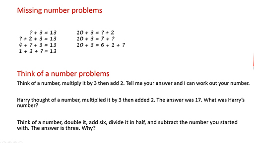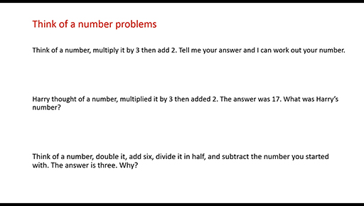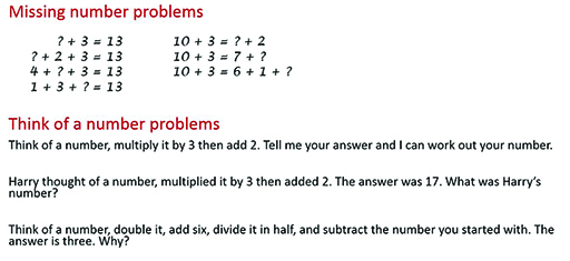 Two examples of such problems are missing number problems and Think of a Number (THOAN) problems.