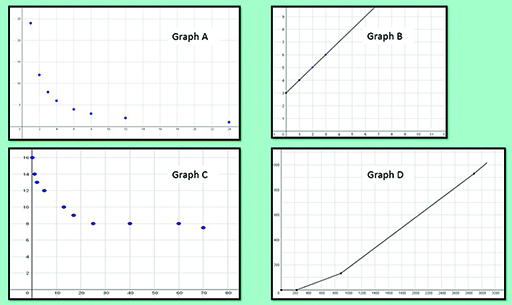 You should have found that graph A showed the relationship between the number of people sharing a box of 24 chocolates and how many chocolates each person gets. One way of checking this is to look for the points (1,24), (2, 12), (3, 8) that all lie on the graph. The graph is decreasing. Notice also that this graph is shown as a set of discrete points since the number of people and the number of chocolates are both discrete variables.