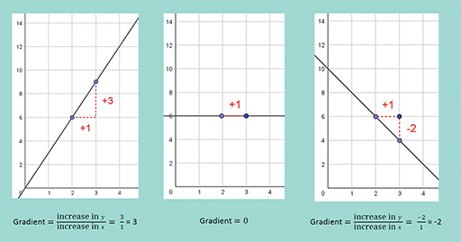 If a linear graph is increasing then its gradient is positive, since when increases by 1, y changes by a positive number. If a linear graph is decreasing, the gradient is a negative number.
