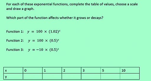 This feature lies behind the English phrase ‘growing exponentially’ which is used to emphasise rapid growth. It also makes exponential functions difficult to graph. The scale on the y-axis has to be large to include the points for higher values of x, but then the y-values for low values of x are not easy to read.