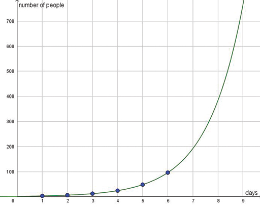 In this problem, the number of new people who learn the secret each day is equal to the number who know it already. This makes it an example of an exponential function. The characteristic feature of these functions is that their rate of change is proportional to their value. In more everyday words, this means that the higher the y-value, the more it grows.