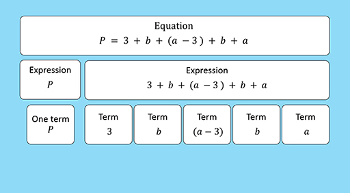 An algebraic expression is a calculation, written in standard arithmetic notation, where one or more numbers has been replaced with a symbol. If an expression involves addition or subtraction then the parts that are added or subtracted are called ‘terms’. The video below shows the parts of an equation which are algebraic expressions and then shows how the expressions are made up of algebraic terms.