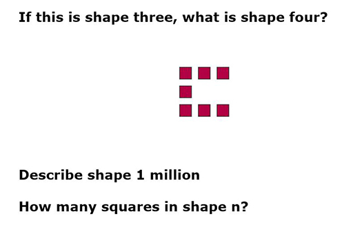 For this problem, you might allow the class to divide into two groups: those who want to extend only the ‘arms’ of the C (so that the fourth shape has 9 squares) and those who have also extended its ‘spine’ (so it has 10). Either method can be justified but they lead to different expressions.