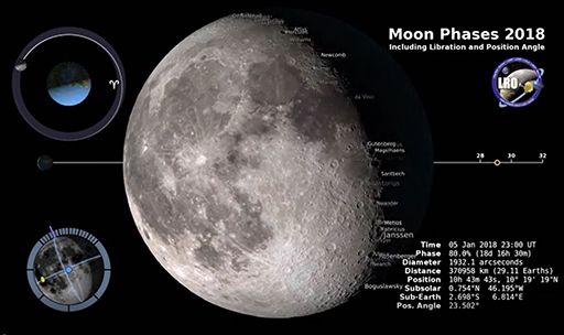 The video here shows the Moon’s phases throughout the year 2013. Concentrate on the main picture rather than the information around the edges. As well as the phase changes, you will notice it changing a little in apparent diameter as its distance from the Earth varies. You will also see it swinging slightly from side to side. This is called ‘libration’ and is because the Moon’s varying orbital speed alternately gets slightly ahead of and then lags slightly behind its constant rate of rotation.