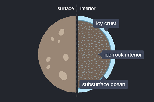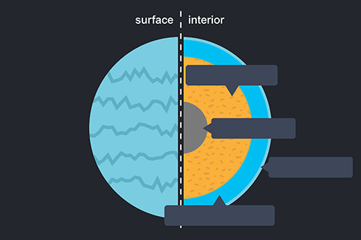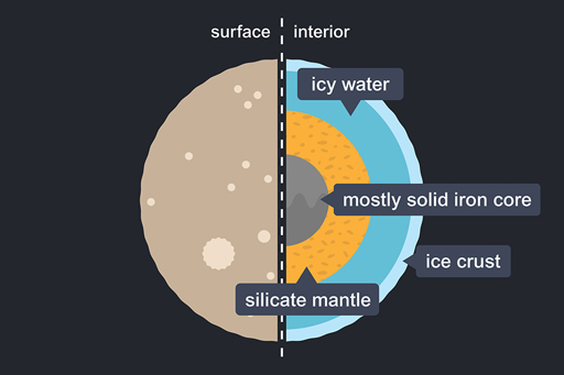 Ganymede is composed of approximately equal amounts of silicate rock and water-ice. It is believed to be a fully differentiated body with an iron-rich core. A saltwater ocean is believed to exist nearly 200 km below Ganymede’s surface, sandwiched between layers of ice.