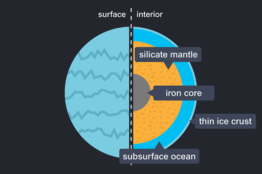 It is believed that Europa has an outer layer of water around 100 km thick, some as frozen-ice upper crust and some as liquid ocean underneath the ice. Below the ocean, occupying most of Europa’s volume, is a rocky interior. This probably contains metallic iron core at the centre.