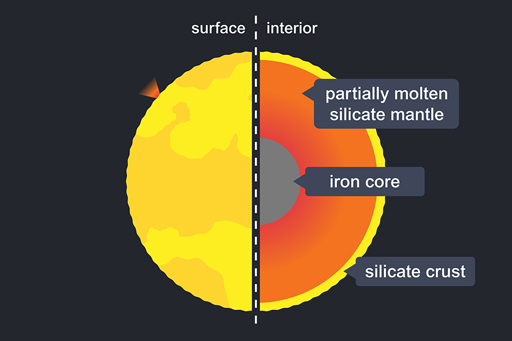 Io is composed primarily of silicate rock and iron. Io is closer in bulk composition to the terrestrial planets than to other moons in the outer Solar System, which are mostly composed of a mix of water-ice and silicates. Models based on measurements of density and mass distribution suggest that its interior is differentiated between a silicate-rich crust and mantle, and an iron- or iron-sulfide-rich core. Io’s metallic core makes up approximately 20% of its mass.