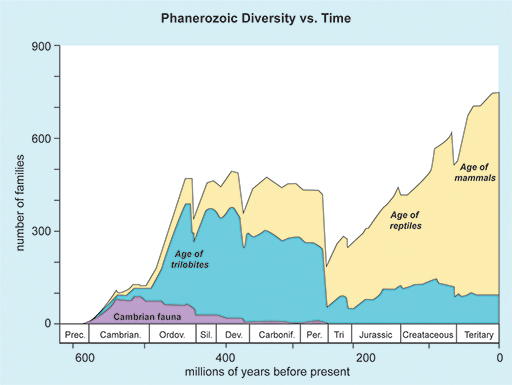 In Figure 11 it is possible to see at least five instances of mass extinction, i.e. the levels where biodiversity shows a downward dip along the y axis (number of families). The most well-known instances and their times (recorded in millions of years ago, or Ma) are: