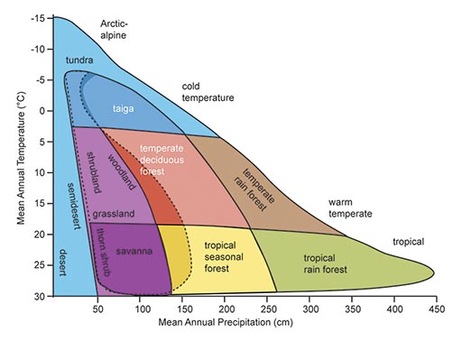 Examine Figure 14, in which different biomes are shown, depending on the prevalent temperature and precipitation. Then complete the following table.