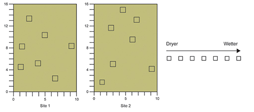 Random sampling is often used when it’s necessary to compare two or more sites. In this method, equal quadrilateral areas are marked out at each site and two sides of each area are numbered to give a coordinate system. The coordinates of quadrats for sampling are chosen at random. Then, by using a highly accurate differential GPS instrument (these are available for hire if you don’t have one), these randomly generated grid coordinates can be loaded into the machine and set out to centimetre-level accuracy at each site. One advantage of this method is that the same locations can be resurveyed over many years to look at changes over time.
